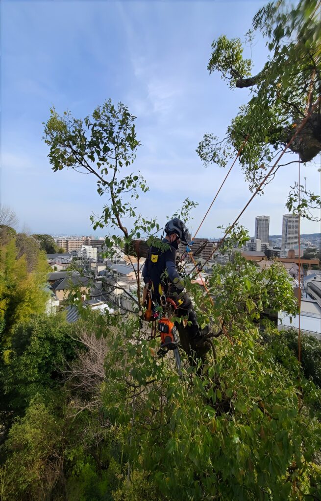 樹上からの剪定は、木の成長や枝の方向を直接確認しながら進めます。地上では届かない繊細な枝の調整も可能です。