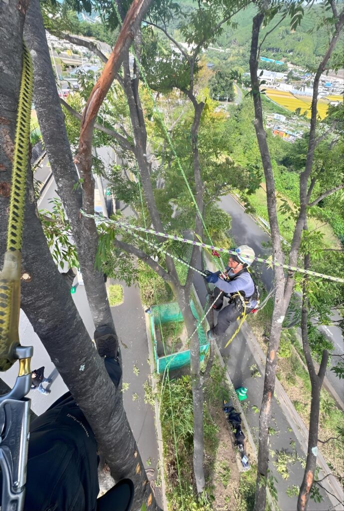鋸・高所作業車・ツリークライミングを併用し、現場の状況に最も適した方法で施工。